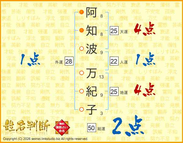 阿(8画)知(8画)波(9画) 万(13画)紀(9画)子(3画)
