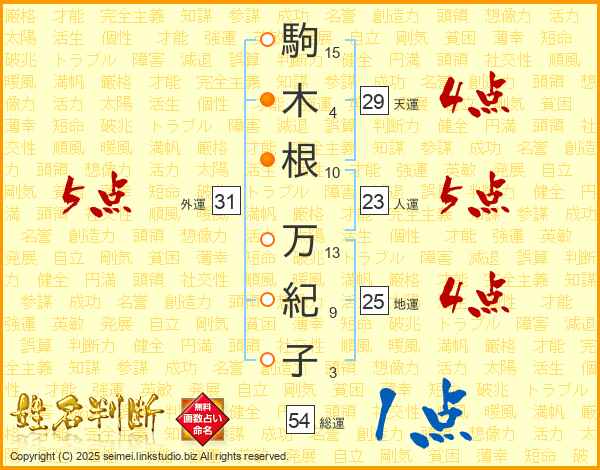 駒(15画)木(4画)根(10画) 万(13画)紀(9画)子(3画)