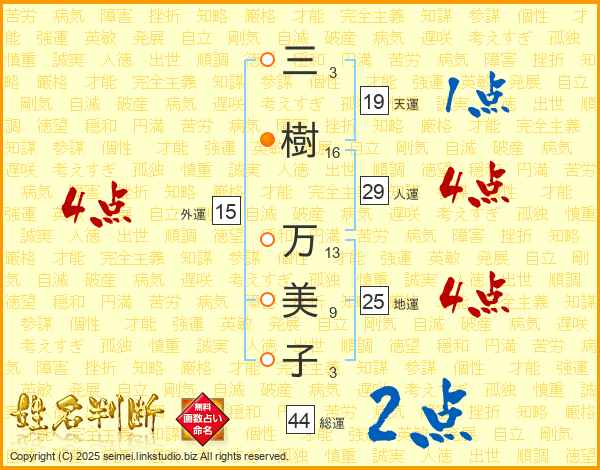 三(3画)樹(16画) 万(13画)美(9画)子(3画)