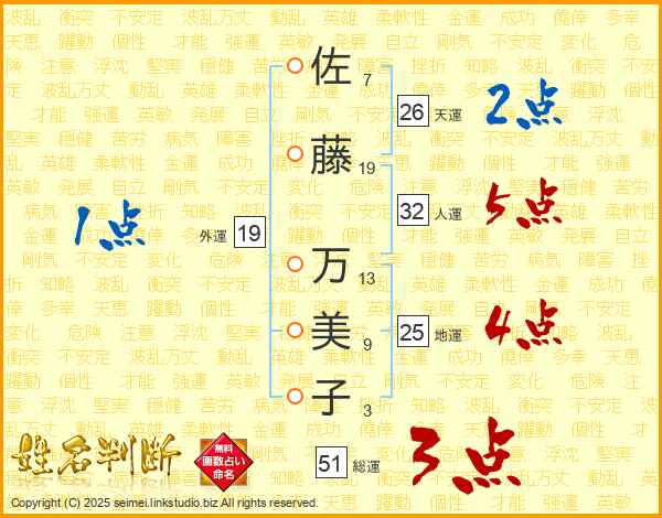 佐(7画)藤(19画) 万(13画)美(9画)子(3画)