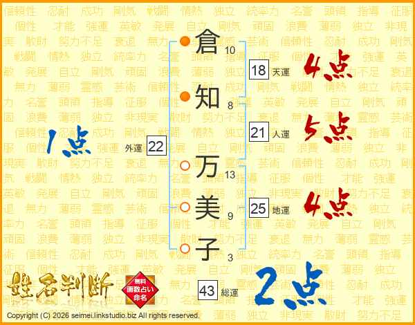 倉知万美子さんの総運は43画の2点!