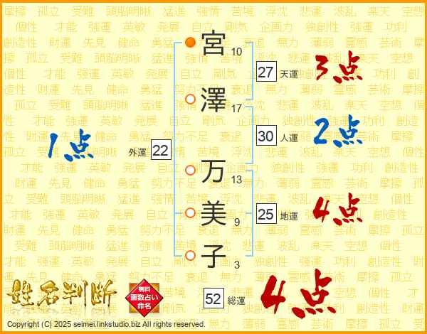 宮(10画)澤(17画) 万(13画)美(9画)子(3画)