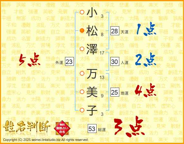 小(3画)松(8画)澤(17画) 万(13画)美(9画)子(3画)