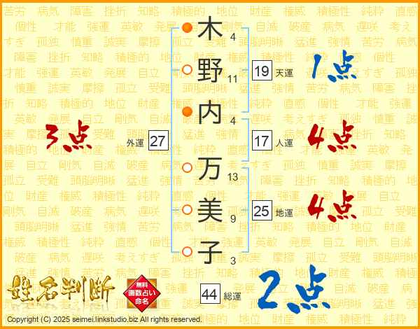 木(4画)野(11画)内(4画) 万(13画)美(9画)子(3画)