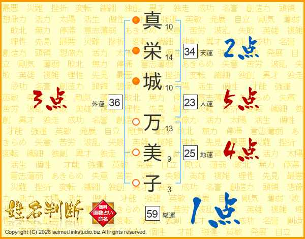 真(10画)栄(14画)城(10画) 万(13画)美(9画)子(3画)