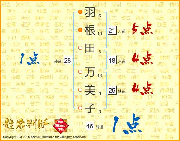 羽(6画)根(10画)田(5画) 万(13画)美(9画)子(3画)
