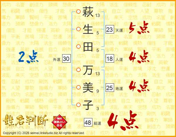 萩(13画)生(5画)田(5画) 万(13画)美(9画)子(3画)