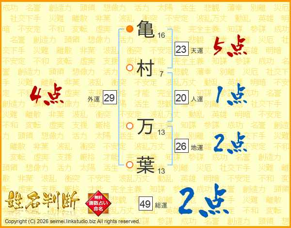 亀(16画)村(7画) 万(13画)葉(13画)