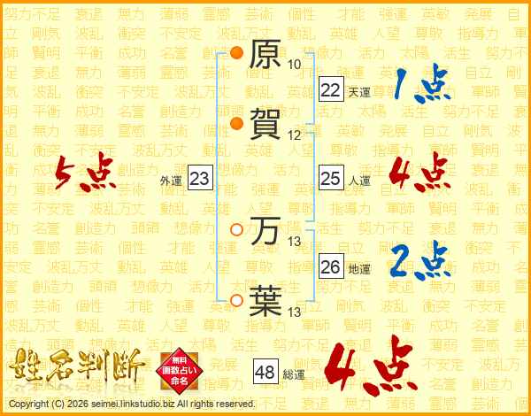 あなたの人生を表す1番重要な運勢です。生涯を通じて影響する総合運となり、主に50歳以降の晩年期に影響を及ぼします。苗字と名前の合計画数。
