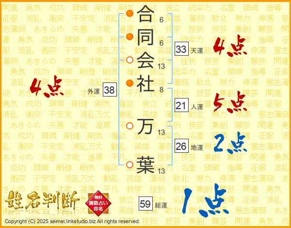 合(6画)同(6画)会(13画)社(8画) 万(13画)葉(13画)