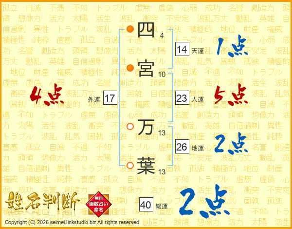 生活面を象徴する運勢です。外部から受ける影響力を表し、結婚運、家庭運や職場、環境への順応性を表します。総運から人運を引いた画数。姓や名が1文字の場合を除く。