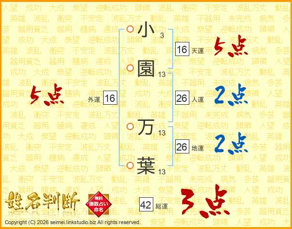 生活面を象徴する運勢です。外部から受ける影響力を表し、結婚運、家庭運や職場、環境への順応性を表します。総運から人運を引いた画数。姓や名が1文字の場合を除く。