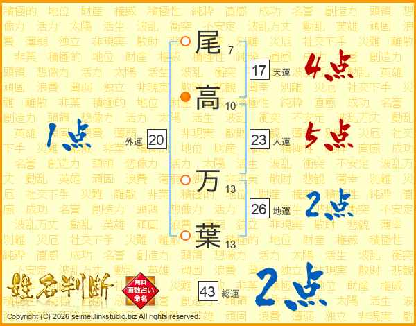 生活面を象徴する運勢です。外部から受ける影響力を表し、結婚運、家庭運や職場、環境への順応性を表します。総運から人運を引いた画数。姓や名が1文字の場合を除く。