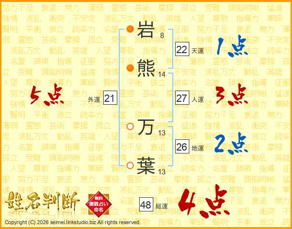 岩(8画)熊(14画) 万(13画)葉(13画)