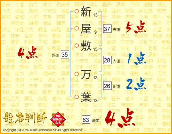 新(13画)屋(9画)敷(15画) 万(13画)葉(13画)