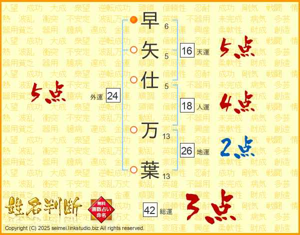 早(6画)矢(5画)仕(5画) 万(13画)葉(13画)