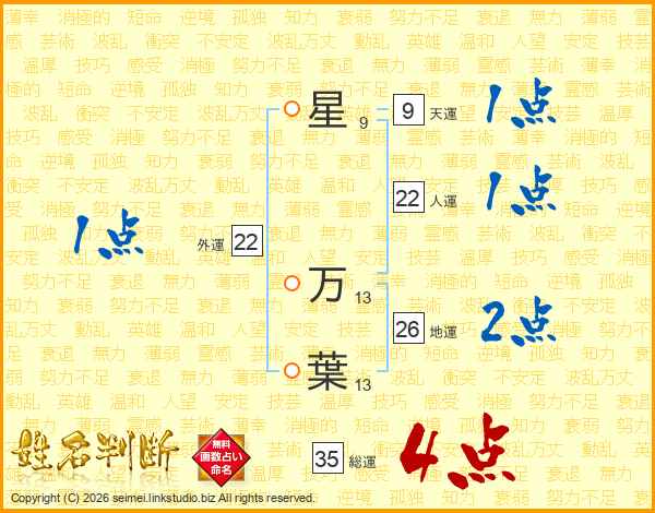 生活面を象徴する運勢です。外部から受ける影響力を表し、結婚運、家庭運や職場、環境への順応性を表します。総運から人運を引いた画数。姓や名が1文字の場合を除く。