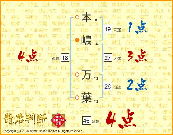 本(5画)嶋(14画) 万(13画)葉(13画)
