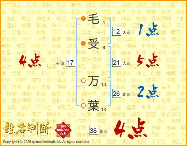 生活面を象徴する運勢です。外部から受ける影響力を表し、結婚運、家庭運や職場、環境への順応性を表します。総運から人運を引いた画数。姓や名が1文字の場合を除く。