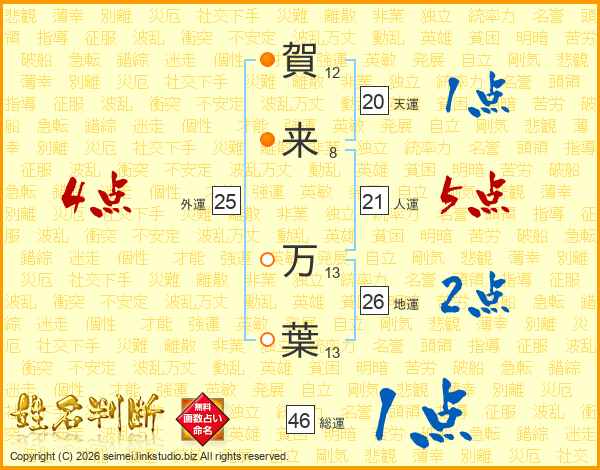 賀(12画)来(8画) 万(13画)葉(13画)