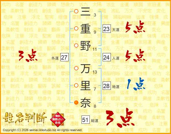 三(3画)重(9画)野(11画) 万(13画)里(7画)奈(8画)