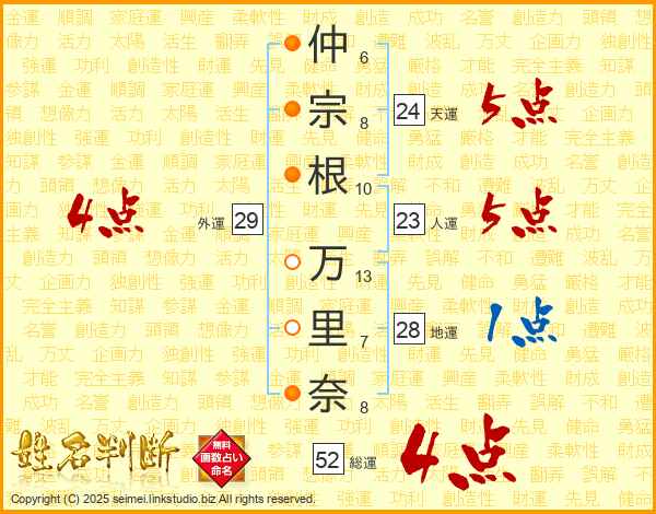 仲(6画)宗(8画)根(10画) 万(13画)里(7画)奈(8画)
