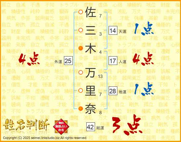 佐(7画)三(3画)木(4画) 万(13画)里(7画)奈(8画)