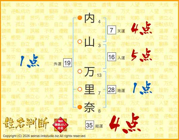 内(4画)山(3画) 万(13画)里(7画)奈(8画)