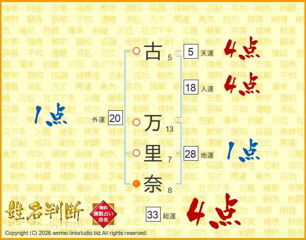 古(5画) 万(13画)里(7画)奈(8画)