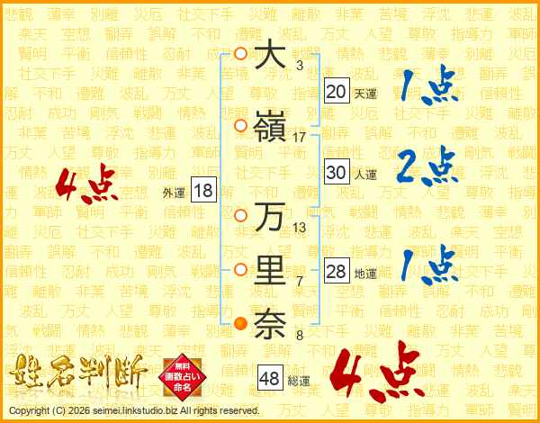 大(3画)嶺(17画) 万(13画)里(7画)奈(8画)