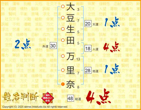 大(3画)豆(7画)生(5画)田(5画) 万(13画)里(7画)奈(8画)