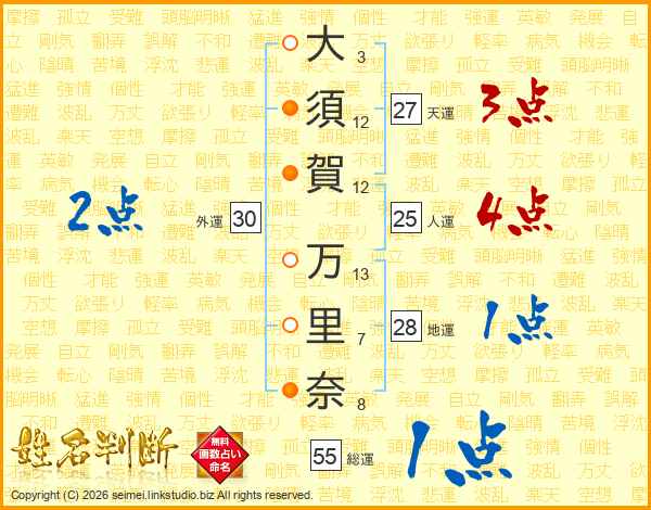 大(3画)須(12画)賀(12画) 万(13画)里(7画)奈(8画)