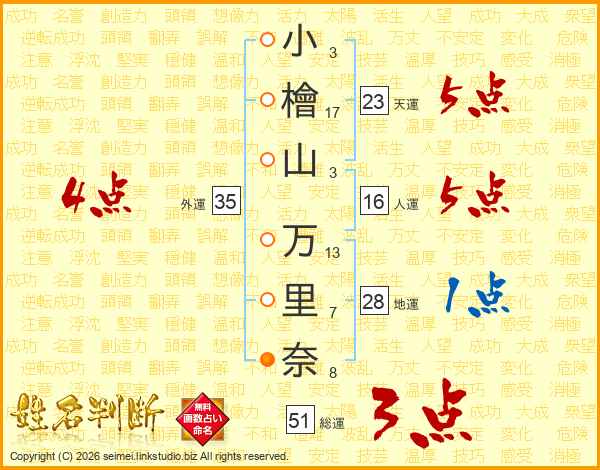小(3画)檜(17画)山(3画) 万(13画)里(7画)奈(8画)
