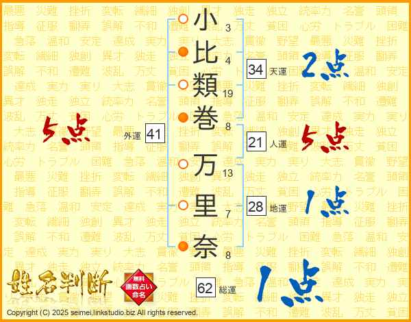 小(3画)比(4画)類(19画)巻(8画) 万(13画)里(7画)奈(8画)