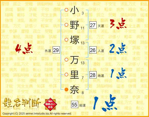 小(3画)野(11画)塚(13画) 万(13画)里(7画)奈(8画)