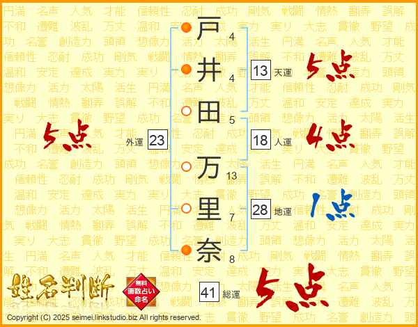 戸(4画)井(4画)田(5画) 万(13画)里(7画)奈(8画)