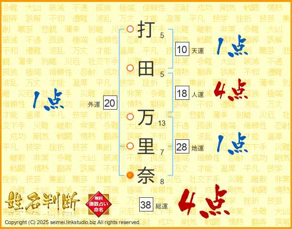 打(5画)田(5画) 万(13画)里(7画)奈(8画)