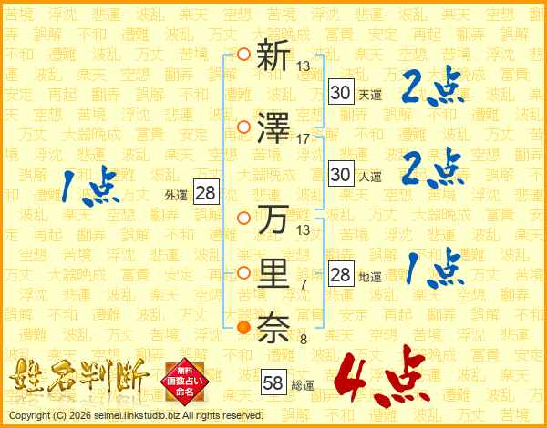 新(13画)澤(17画) 万(13画)里(7画)奈(8画)