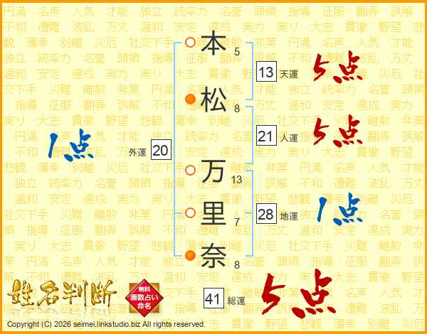 本(5画)松(8画) 万(13画)里(7画)奈(8画)
