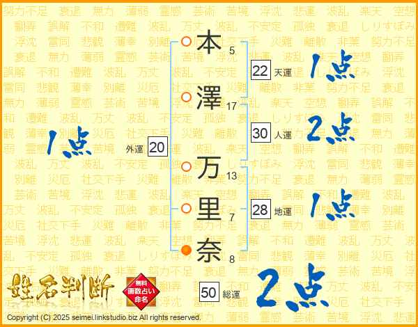 本(5画)澤(17画) 万(13画)里(7画)奈(8画)