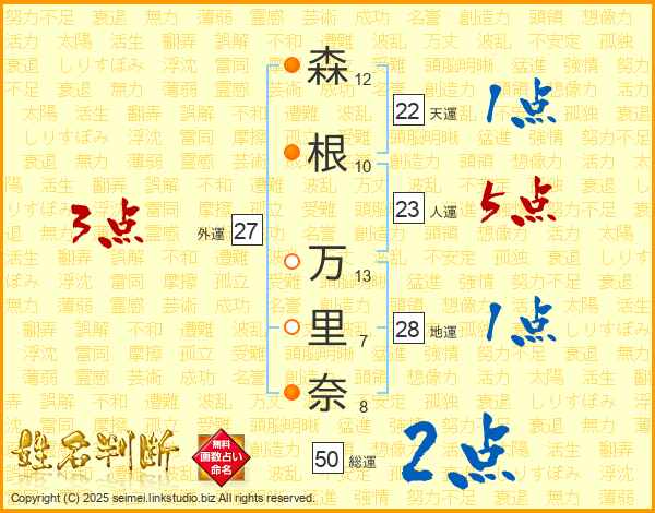 森(12画)根(10画) 万(13画)里(7画)奈(8画)