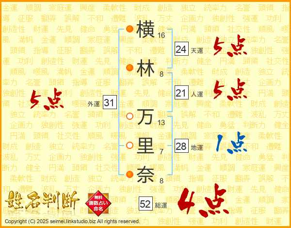 横(16画)林(8画) 万(13画)里(7画)奈(8画)