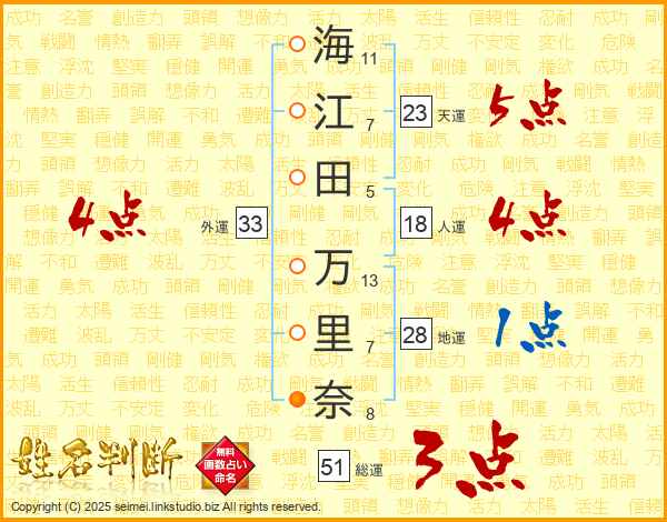 海(11画)江(7画)田(5画) 万(13画)里(7画)奈(8画)