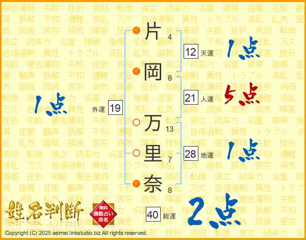 片(4画)岡(8画)  万(13画)里(7画)奈(8画)
