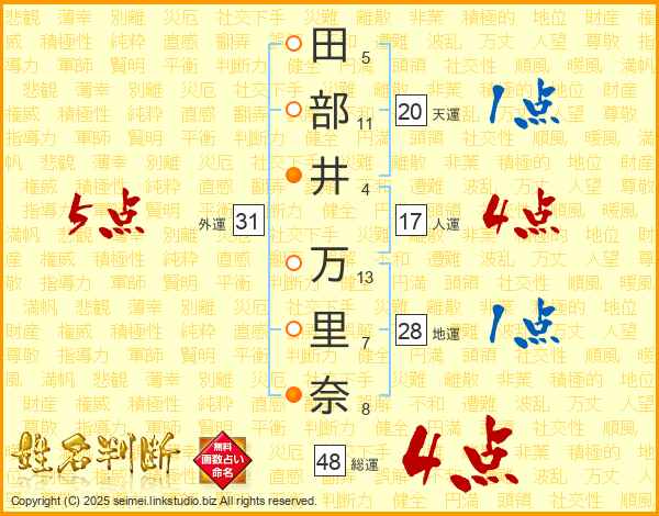 田(5画)部(11画)井(4画) 万(13画)里(7画)奈(8画)