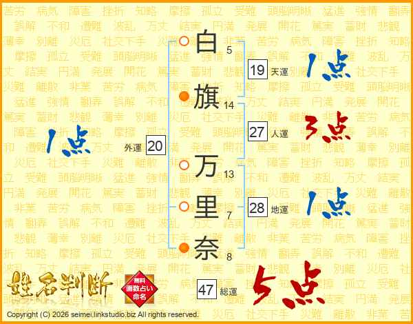 白(5画)旗(14画) 万(13画)里(7画)奈(8画)