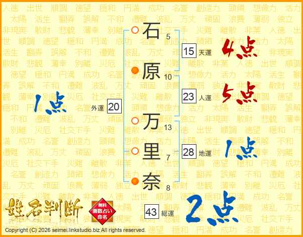 石原万里奈さんの総運は43画の2点!