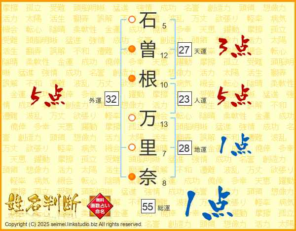 石(5画)曽(12画)根(10画) 万(13画)里(7画)奈(8画)
