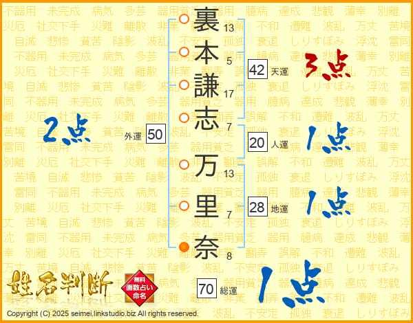 裏(13画)本(5画)謙(17画)志(7画) 万(13画)里(7画)奈(8画)