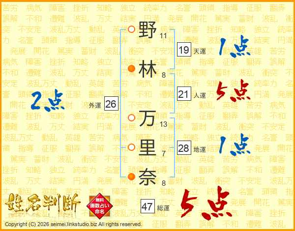 野(11画)林(8画) 万(13画)里(7画)奈(8画)